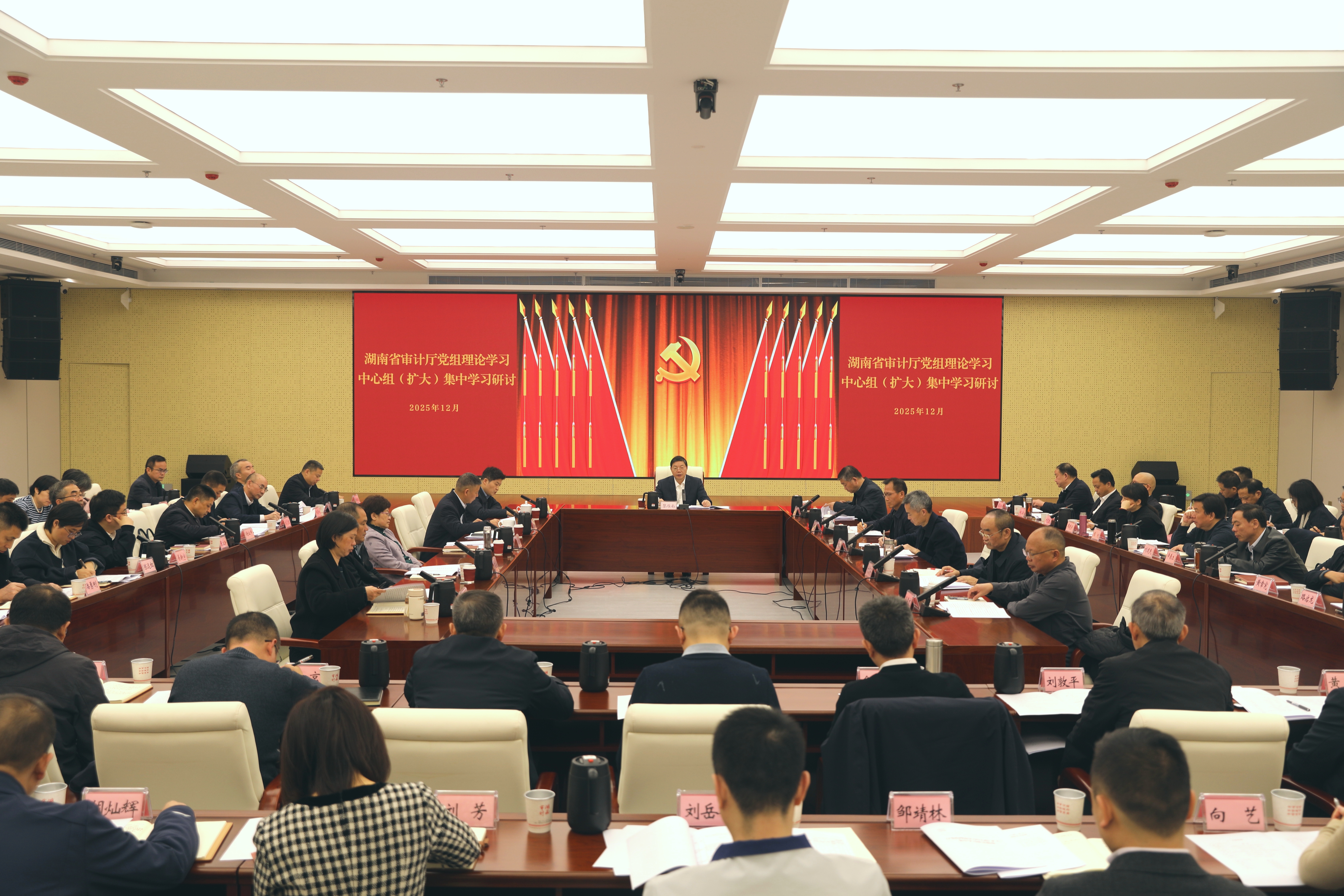 12月17日,省审计厅党组理论学习中心组(扩大)开展集中学习,传达学习贯彻党的二十届四中全会、中央经济工作会议和省委十二届九次全会精神,重点围绕学习贯彻党的二十届四中全会精神开展了专题研讨。省委审计办主任,厅党组书记黎雁南主持会议并讲话。厅领导、二级巡视员、驻厅纪检监察组负责同志,各市州和湘江新区审计局、厅属各单位主要负责同志参加学习。