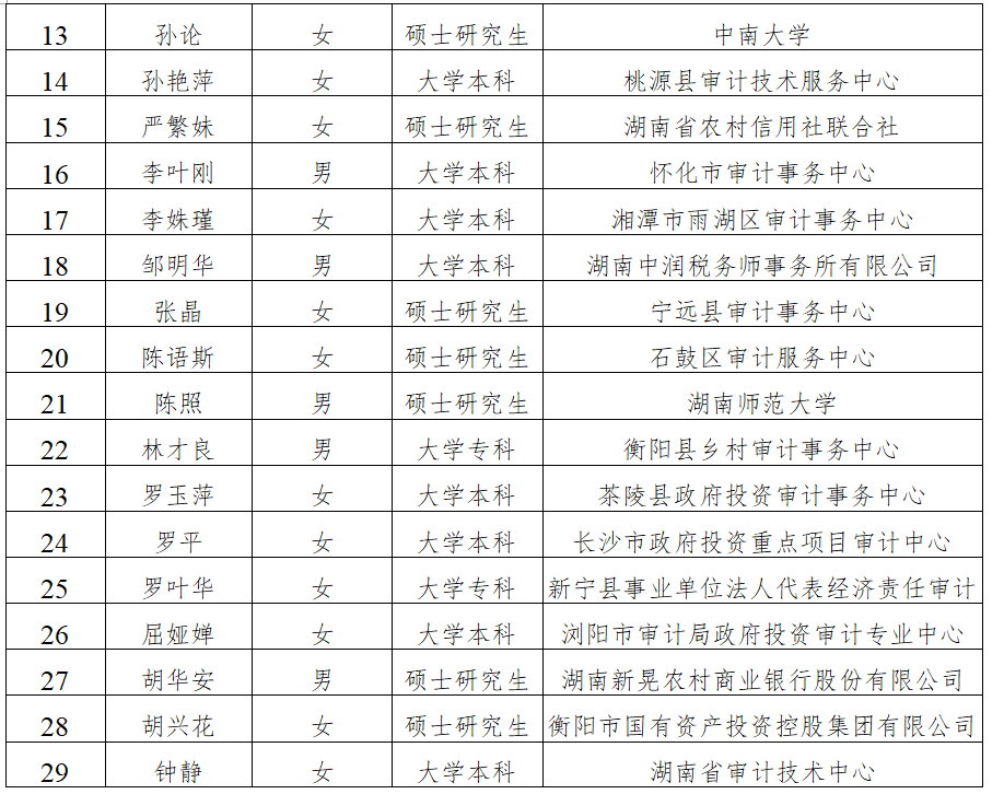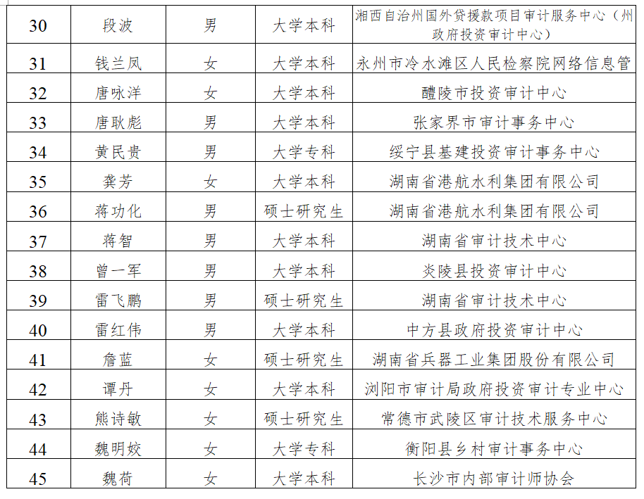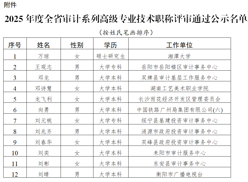 按照《湖南省人力资源和社会保障厅关于做好2025年度全省高级职称评审工作的通知》(湘人社函〔2025〕29号)的规定,我省2025年度审计系列高级专业技术职称评审工作已按规定程序和要求完成。现将经省审计系列高级职称评审委员会评审通过人员名单予以公示,公示时间为12月8日至12月12日。